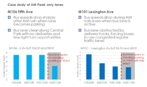 We were tasked to examine bus lanes in New York City for differences in enforcement needs based on actual bus speed data from GPS-based automated vehicle locator (AVL) systems.  In New York, bus lanes are utilized for a number of different purposes, such as hosting right turn traffic, permitting commercial loading activities or even on-street parking during off-peak periods, etc.  By comparing average bus speeds by time-of-day over specific street segments, we were able to determine which bus lanes had the most severe impact from those non-bus activities.  More importantly, we were also able to determine which bus lanes saw the highest frequency of likely violations, by comparing the peak and off-peak bus travel times.  Using this information, the Department of Transportation was able to target enforcement activities during the time-of-day and on the specific street segments where it was likely to yield most return on enforcement dollars invested.