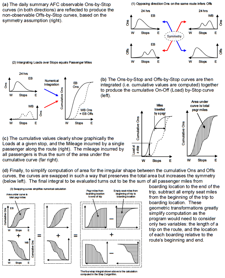 In one of the first production application for extensive analysis of “big” data in a U.S. transit agency, we designed and implemented a user-friendly computer program that automatically detected and corrected inevitable data errors in the daily Automated Fare Collection (AFC) system transaction log files, and devised an algorithm to compute actual aggregate mileage travelled by each individual bus passenger on a zero manual intervention and daily reporting basis. This method was approved by the Federal Transit Administration (FTA) as a 100% sample for bus passenger-miles for National Transit Database reporting and Federal Capital funding purposes, replacing previous labour-intensive random sample practices with higher error margins. At the time, the AFC transaction logs were not broken down by trip, no electronic bus driver sign-on data was available, and no geo-location information was available from the buses. This resulted in various heuristics being necessary to derive the required results. Since that time, the agency has progressively moved towards equipping all buses with automated passenger counters and automated vehicle location systems. However, until 100% of the fleet is fitted with entrance-exit door sensors, this farecard-based method of measuring passenger ridership and passenger-miles remains in daily production use.